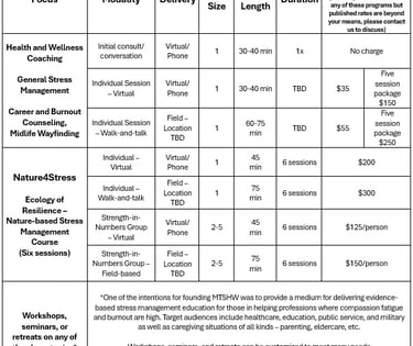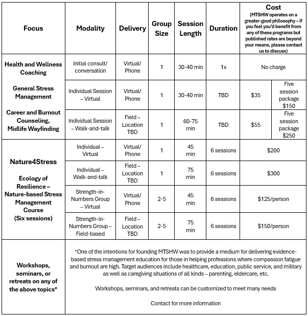 Individual virtual or in-person sessions are offered, but you may get the most benefit from the six-part Nature4Stress program, an abbreviated version of the evidence-based academic course introducing the nature-based Ecology of Resilience framework described here. Group plans are also available. Or check out Program options.